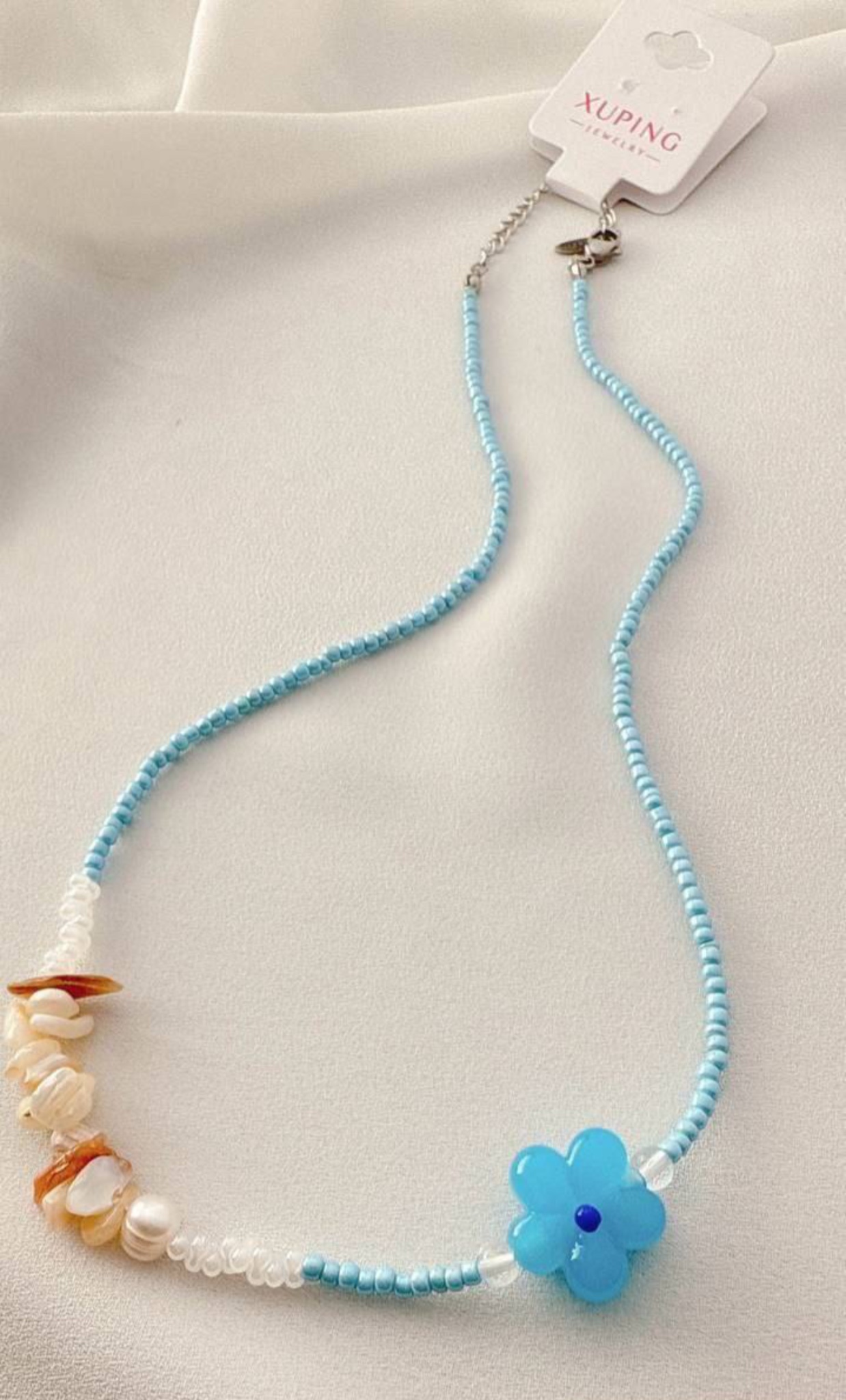 گردنبند دخترانه ژوپینگ مدل گل فانتزی و مهرههای سنگی آبی کد ۴۱۹