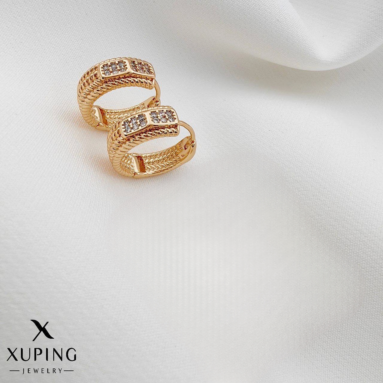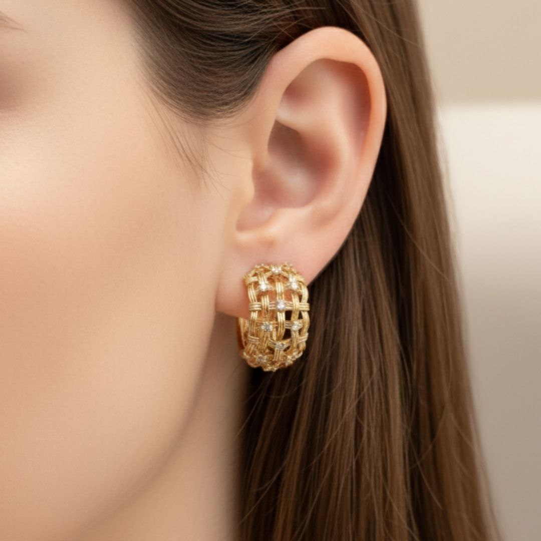 گوشواره حلقه‌ای کوچک طلایی ژوپینگ با طرح بافت ضربدری و نوار نگین‌دار