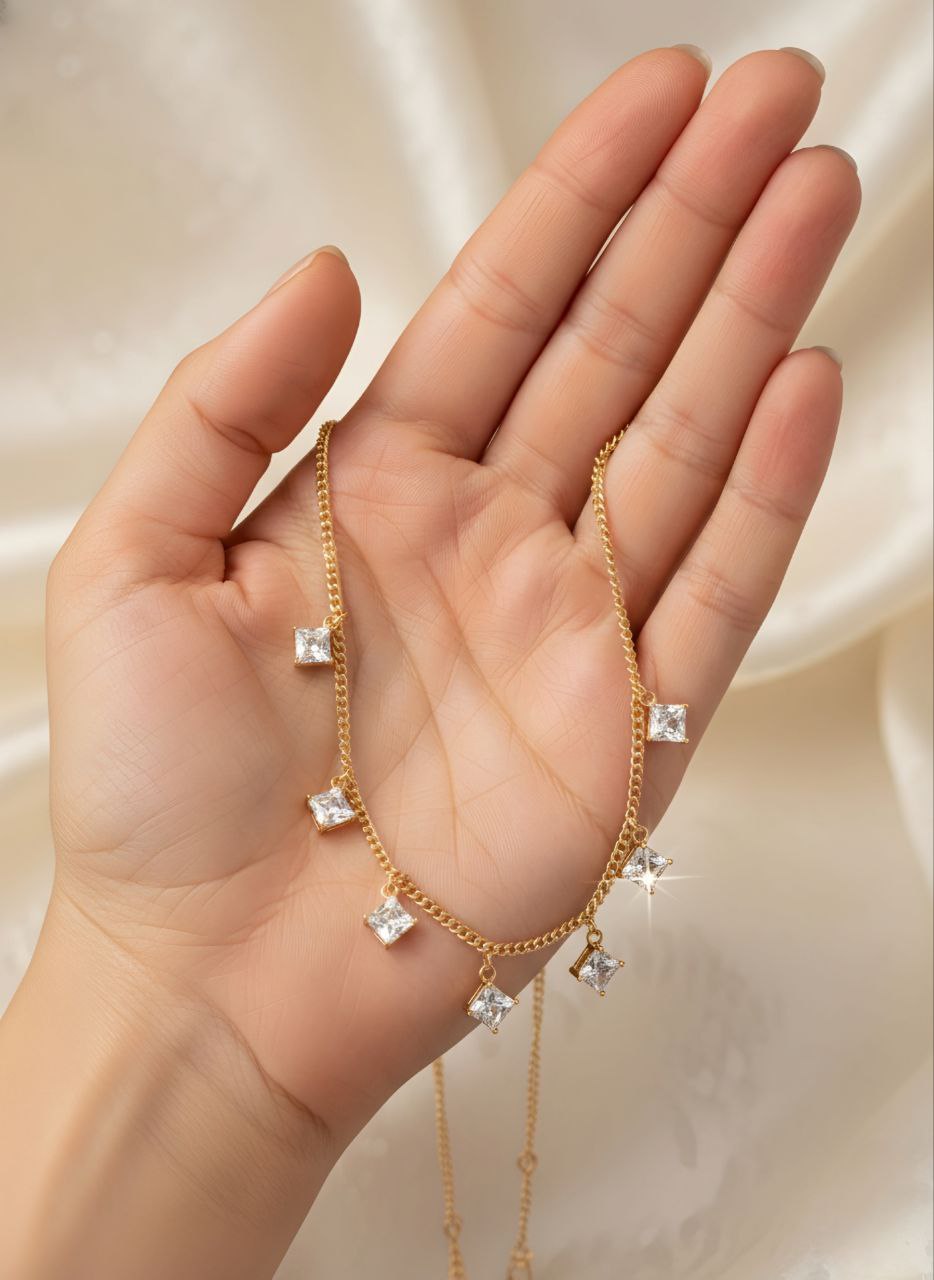 • طراحی: زنجیر مدل کارتیر ظریف که با ۷ عدد کریستال درخشان با تراش مربعی (پرنسس) تزئین شده است.