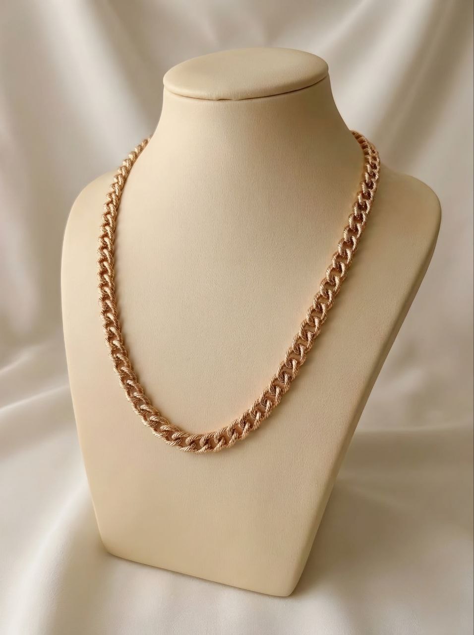 این گردنبند از برند معتبر ژوپینگ (Xuping) با طراحی کلاسیک کارتیر بافت (Curb Chain) تولید شده است. دانههای زنجیر دارای تراشهای ظریفی هستند که درخشش آن را مشابه طلا کرده است.