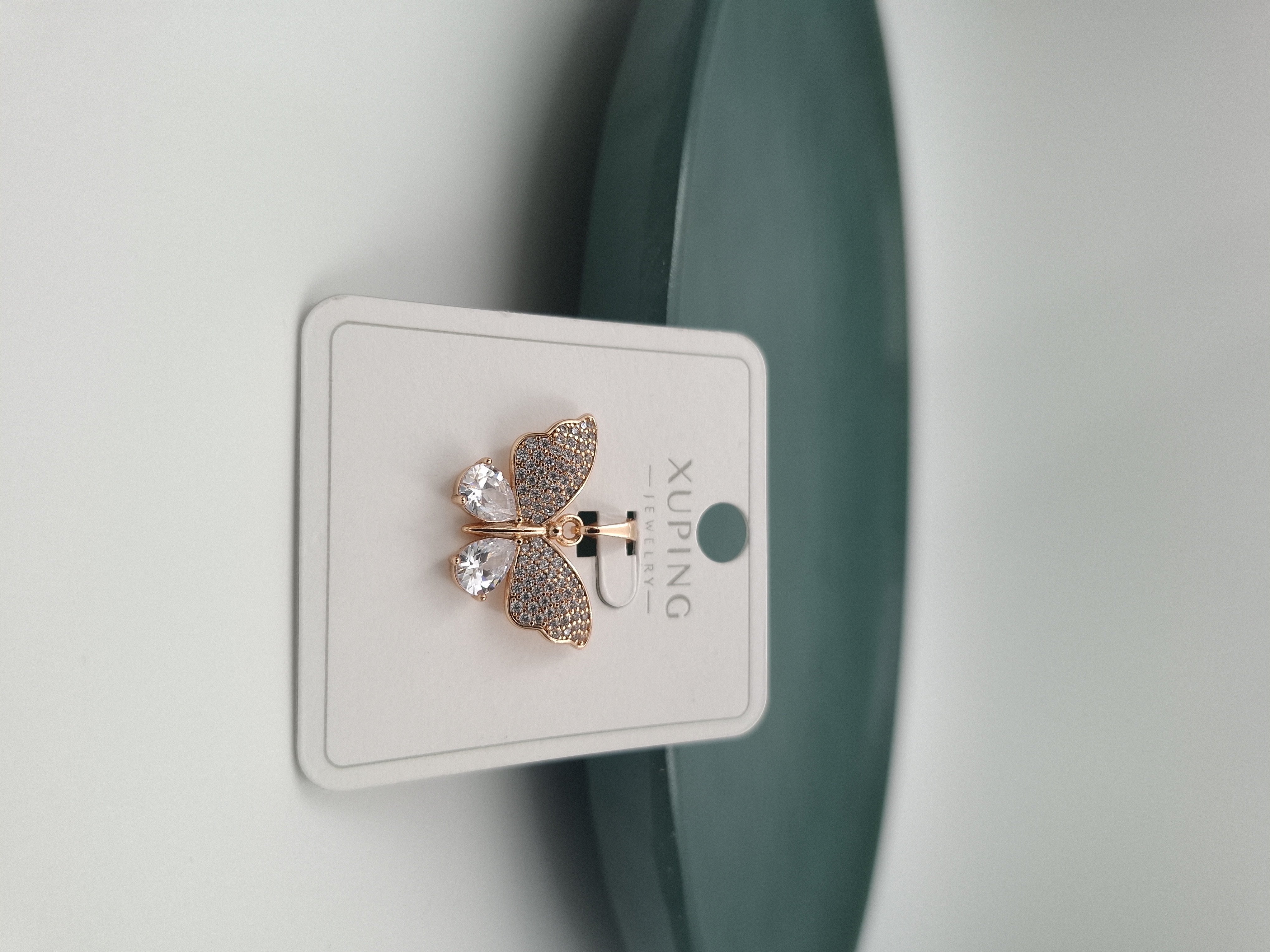 این پلاک ظریف از برند معتبر ژوپینگ (Xuping) با طراحی منحصربهفرد پروانه ساخته شده است. بالهای بالایی با نگینهای ریز اتمی مخراجکاری شده و بالهای پایینی از دو نگین درشت اشکیشکل درخشان تشکیل شدهاند.