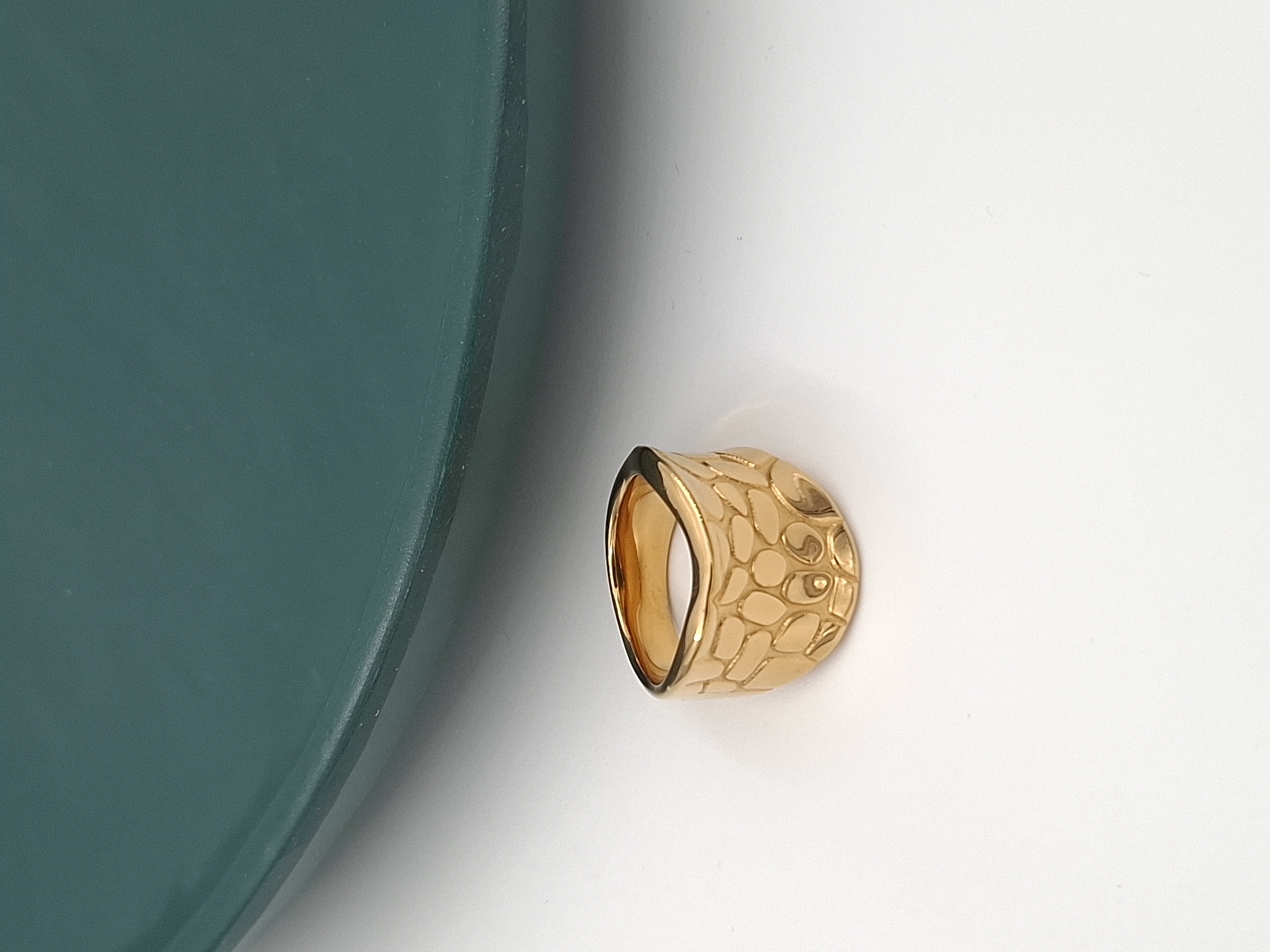 این انگشتر از جنس استیل باکیفیت طراحی شده که با درخشش طلایی و پهنای مناسب، جلوهای خاص به دستان شما میبخشد. طراحی سطح این انگشتر الهام گرفته از نقوش نامنظم سنگی و کوبیده است که در نور، تلالو زیبایی ایجاد میکند. این محصول ضد حساسیت بوده و برای استفاده روزمره یا ست کردن با استایلهای کژوال و مدرن گزینهای ایدهآل است.