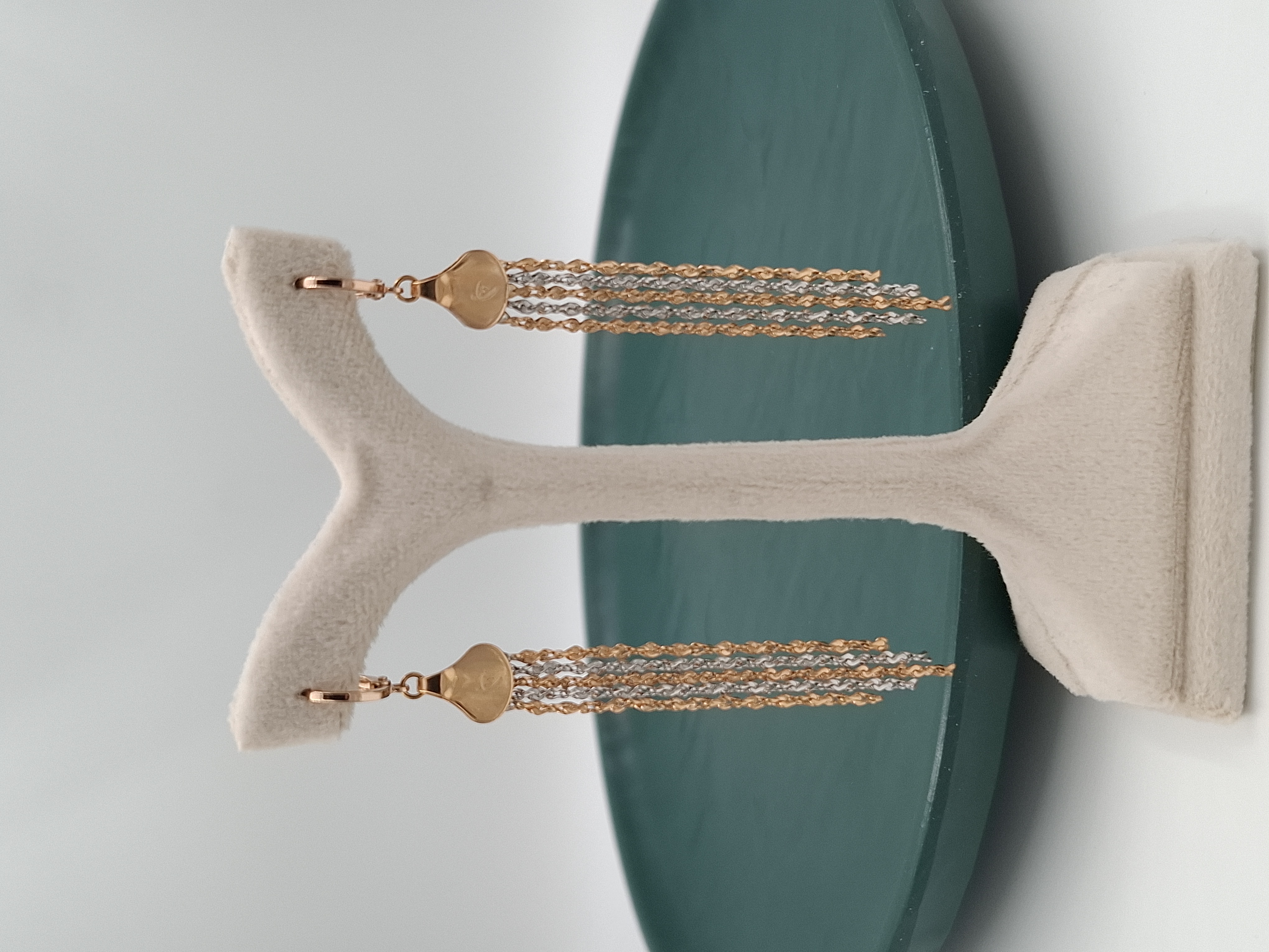 این گوشوارههای ظریف از برند معتبر ژوپینگ با طراحی مدرن و خاص خود، ترکیبی از زنجیرهای ریز بافت در دو رنگ طلایی و نقرهای (رودیوم) هستند. مدل قفل این کار از نوع حلقهای (فرانسوی) بوده که استفاده از آن بسیار راحت و امن است. به دلیل کیفیت بالای آبکاری ژوپینگ، این محصول کاملاً ضد حساسیت است. طراحی آویز و حرکت زنجیرها، جلوهای درخشان به استایل مجلسی و روزمره شما میبخشد.