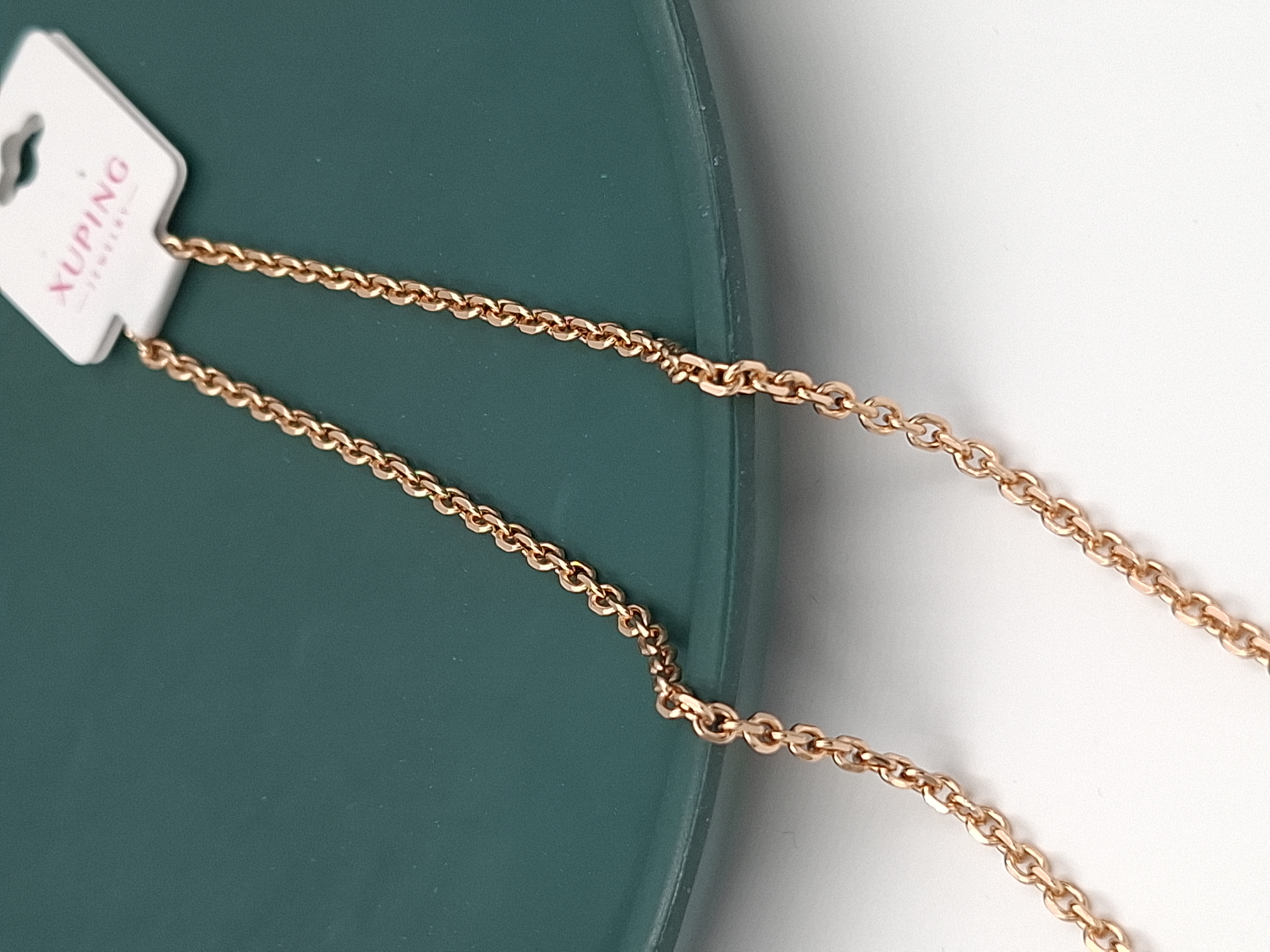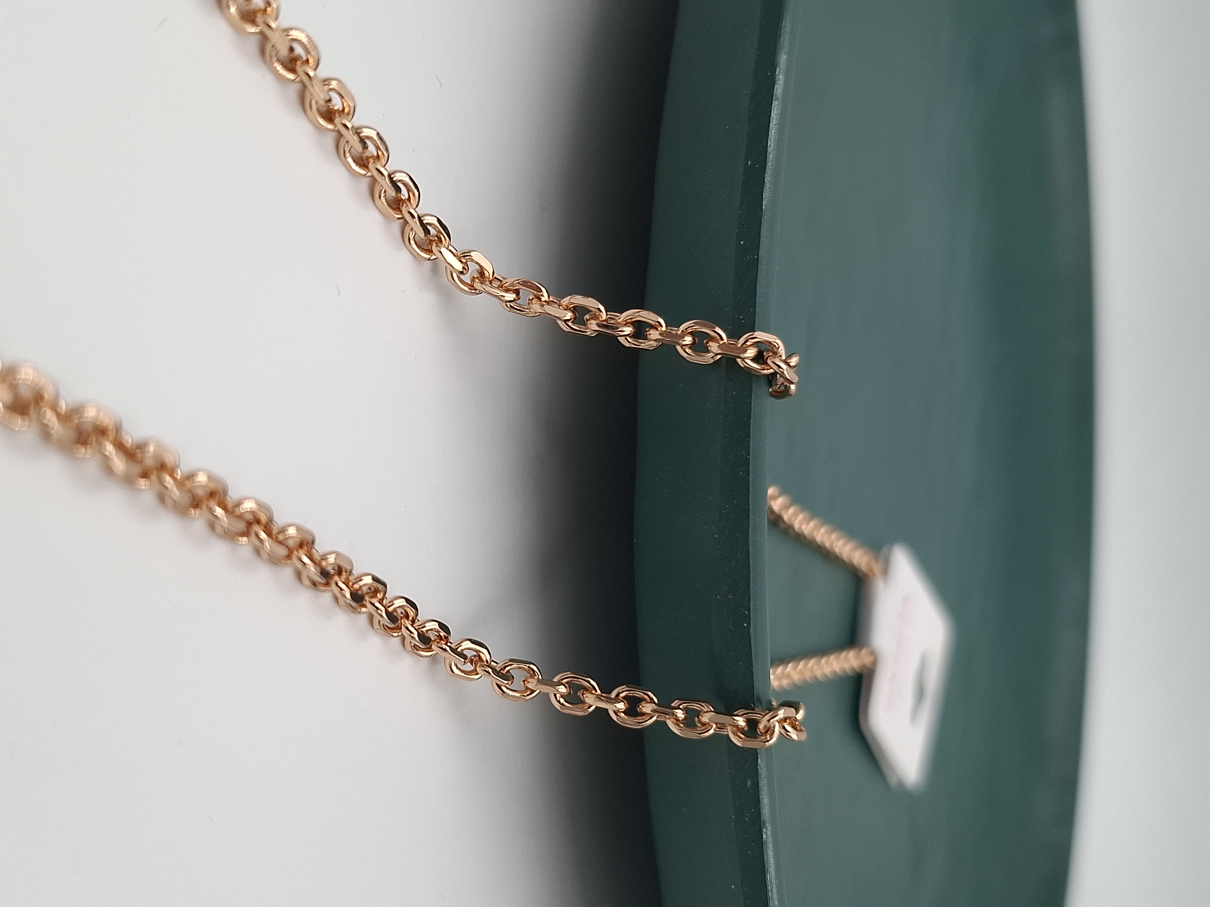 این زنجیر از برند معتبر ژوپینگ با آبکاری طلای ۱۸ عیار تهیه شده است. طراحی آن به سبک رولو (Rolo) بوده که شامل حلقههای دایرهای متصل به هم است و ظاهری کلاسیک و در عین حال مدرن دارد.