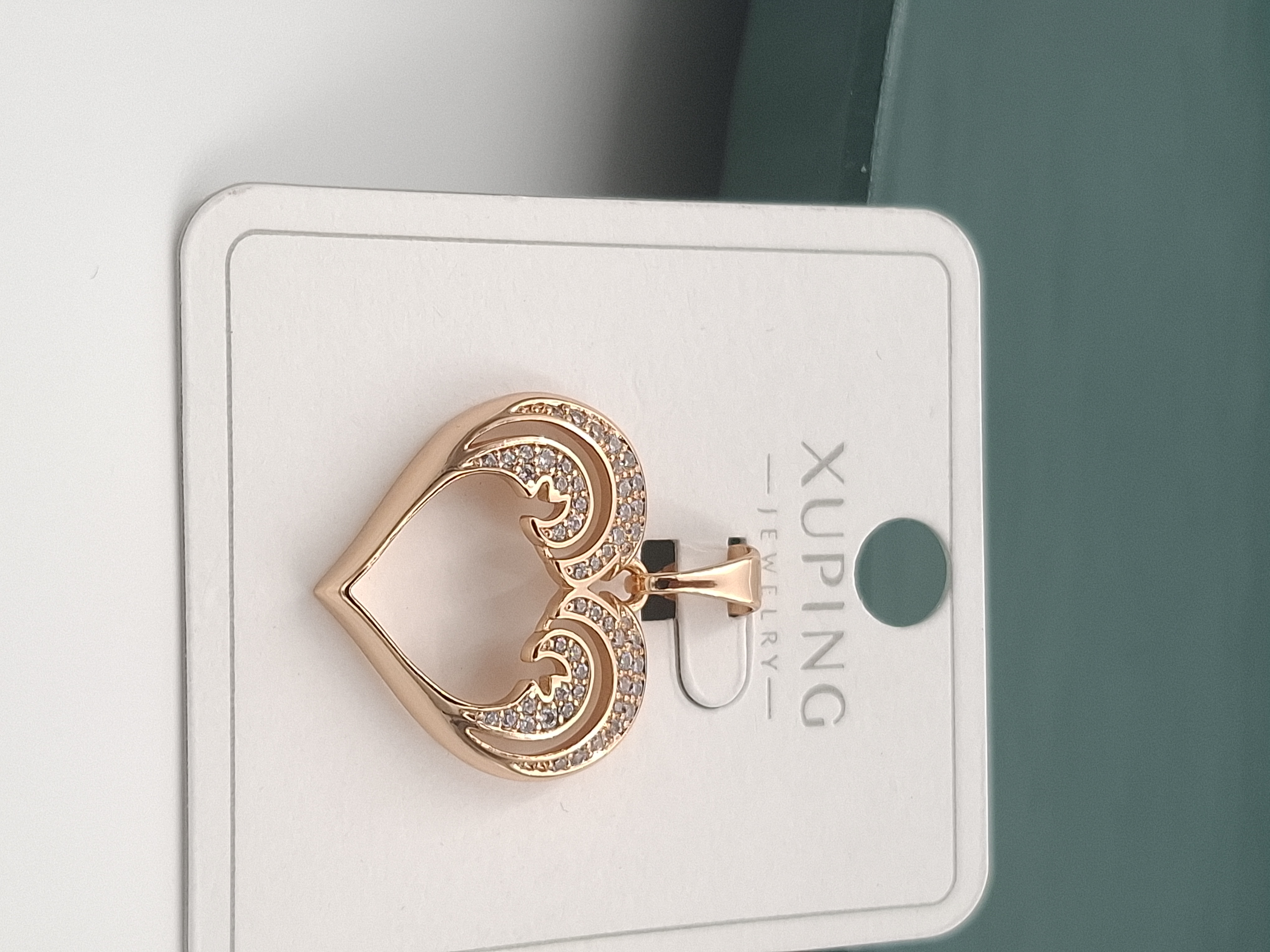 این پلاک زیبا از برند محبوب ژوپینگ (Xuping) با طراحی خاص و رمانتیک به شکل قلب تولید شده است. بخش بالایی قلب با دو انحنای ظریف و نگینهای درخشان اتمی (میکرو ستینگ) تزئین شده که جلوهای مانند جواهرات اصل به آن میبخشد.